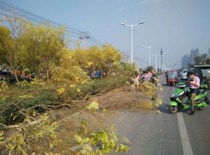 图一:被撞断的树木倒在了机动车道上。