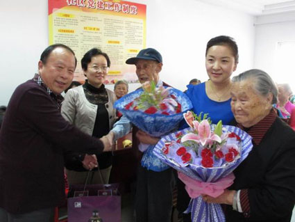 联谊活动还专门邀请来98岁的朱先生和97岁的鲁女士两位社区高龄老人,中兴社区党组织和淮南日报社进社区的在职党员代表一道,为两位老人送上鲜花和慰问品。联谊活动后,他们还为10位高龄和家庭困难的社区老人送去慰问品,献上浓浓的节日祝福。