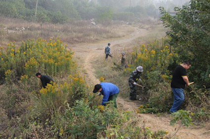 图:舜耕山风景区管理处的工作人员正在清除一枝黄花