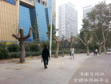 10月23日,有网友向淮南日报社全媒体报料平台反映,经过淮南火车站北边海沃世贸商城旁看到,有5棵粗大的法梧树枝都被锯掉,只剩下树干,不知道是人为破坏,还是什么情况。淮河早报、淮南报业新闻网记者联系园林部门了解到,该5棵法梧系之前已经被人为恶意破坏致死,近日园林部门安排人员将已死的树截枝处理,近期将在原地再栽植新的法梧。
