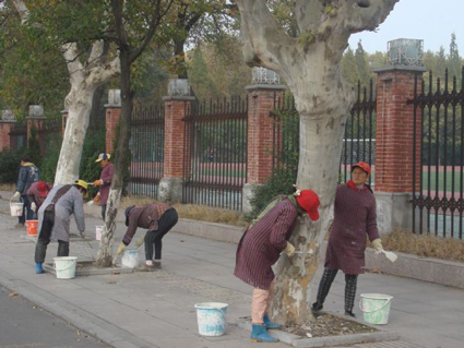11月11日上午,记者从淮南市园林局获悉,从11月初起,园林部门就开始为树木浇第一次透水,让树体充分吸足水分和养分。针对不同的树木采取不同的保暖措施,主要有“包裹”和“涂白”两种方式防寒。通过给树木“涂白”擦“护肤霜”,利用白色对光的反射,让其下部保持相对恒温,缓解低温伤害,另外,涂白对越冬害虫也有杀灭作用。