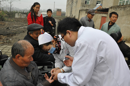 图为:医护人员为老人测血糖。