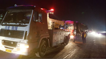 图二:执法人员用拖车将人为破坏的疑似超限超载灰罐车拖到淮南东超限超载监测站进行地磅。