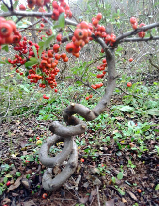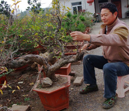 11月18日,记者来到了淮南大通区上窑镇马岗村的一所大院里,只见院里摆满了各式各样的盆景。一些盆景,婀娜多姿,尽管入冬,有的枝叶碧绿青翠,有的满身已披上褐红色或黄色盛装;有梅花、紫薇、石榴、黄杨、海棠等许多品种。王庆龙正忙着给一盆景修枝造型,见到有人来访,他起身热情地招呼着客人。记者与他边走边聊,来到一处山坡下,这里树木成林,空气新鲜。在一苗圃地里,记者惊奇地发现,一些苗木上竟长有“寿”、“福”、字样。王庆龙告诉记者,这是他的新创作,即将成为“草书字”盆景。