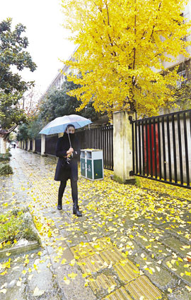 11月24日上午,行走在金家岭路上的市民。气候骤降,伴随降水,给市民的出行带来不少困扰,不过雨中的街道,树叶飘落,别有一番美景。据气象部门了解,受冷空气影响,今明两天气温将持续走低,最低温度将在零下4摄氏度,请出行的市民注意保暖。