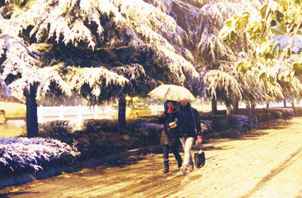 11月24日傍晚6时许,记者在洞山看到,雪越下越大,路上虽说被汽车压的没有积雪,但路边的绿化带里已是白茫茫的一片了。主干道上的汽车开始拥堵,交警站在路中间指挥交通,雪花飘到交警的身上顷刻间就溶化了,水珠顺着大盖帽往下滴。在几个公交车站,站满了等车的人们,路边也站了很多“打的”的人,无奈一辆辆出租车满载着乘客从他们身边驶过,很少有空着的出租车停下。不少人就打着伞,冒雪步行回家。