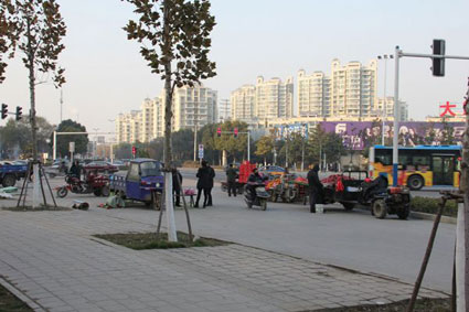 接电后,记者赶到朝阳东路与田大路交叉口,在现场记者看到,多辆三轮车、拖拉机摆放在十字路口西南面的慢车道上,占据了大部分慢车道路面,个别车辆竟停放在人行横道线上经营。据附近市民告诉记者,由于朝阳路与田大路路面都十分宽阔,车速相对较快,水果商贩这样把摊位摆放在路面上,确实很危险,同时也会影响道路交通。所以市民希望有关部门能对这种占道经营的现象给予制止。