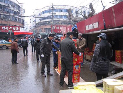 针对此,在前期充分宣传动员的基础上,12月9日上午,田家庵区城管行政执法局四中队组织城管队员、文明劝导员对道路东侧占道经营问题进行规范整治。据介绍,该道路东侧摊点以经营餐点、烟花炮竹为主。从道路北端路口,城管队员一家接着一家劝导,要求能进店的进店经营,条件不允许的要求靠路边经营。每到一处,城管队员和文明劝导员都帮助摊主搬运物品,取得摊主的理解和支持。