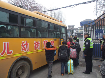 为确保学生安全,交警部门调来两辆正规校车,并派出警力将学生安全送到家。