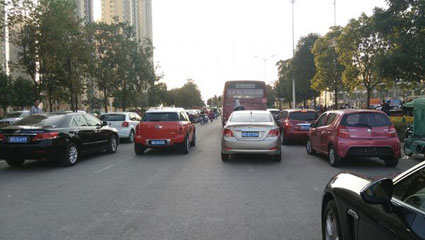 图二:门前道路被堵,公交车、私家车被迫调头、逆行。