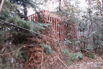 12月19日下午,记者在位于洞山隧道北约200米处,找到了搭建在淮河大道东边绿化带里的违章窝棚(如图)。记者在现场看到,这间窝棚周围是用铁架焊接而成,上盖用杂物拼凑的,窝棚的门朝北。窝棚内堆有许多杂物。记者刚想靠近窝棚,圈养在窝棚内的那条大狗便凶狠地狂叫起来。记者在现场还发现,窝棚周边的绿化带已经遭到不同程度的毁坏。另外,记者还看到,窝棚周边的几棵树的许多枝头也被剪掉。