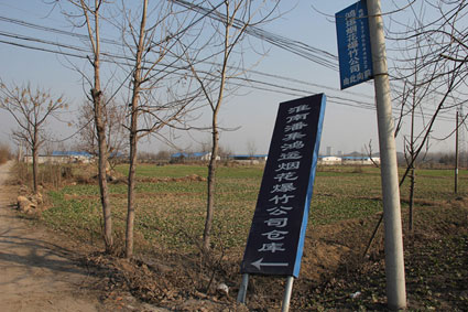 得知这一情况后,记者专门驾车来到潘集区泥河镇,在泥河镇路边,记者随便询问一位路人,非法占地修建的烟花爆竹仓库的位置,路人马上就给记者指出了确切方位。在现场记者看到,麦地中间有着一片新建的建筑群。该建筑群远离村庄和道路,只有一条土路通往仓库大门。根据仓库门前的标牌显示,这里就是淮南潘集鸿运烟花爆竹公司仓库。记者进入仓库大门发现,仓库内有两辆大型货车,正在卸载所运的货物往仓库内储存。正当记者在仓库内观察时,从仓库内出来一名工作人员,告诉记者,这里是烟花爆竹仓库,禁止外人进入。