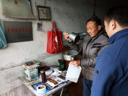 图为“文明诚信经营户”刘明礼正在给客人称量散酒。