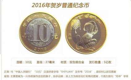 记者在央行的官方网站上了解到,该纪念币正面刊有“中国人民银行”、“10元”、汉语拼音字母“SHIYUAN”及年号“2016”字样,底纹衬以花团图案。背面主景图案为一只传统装饰造型的猴子,抬手远眺;其上方为桃形花灯和梅花图案,币面左侧刊“丙申”字样。该普通纪念币面额为10元,直径为27毫米,材质为双色铜合金,与现行流通人民币职能相同,与同面额人民币等值流通。