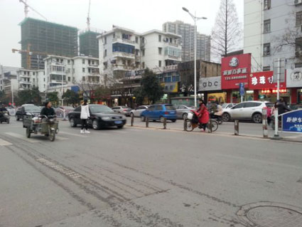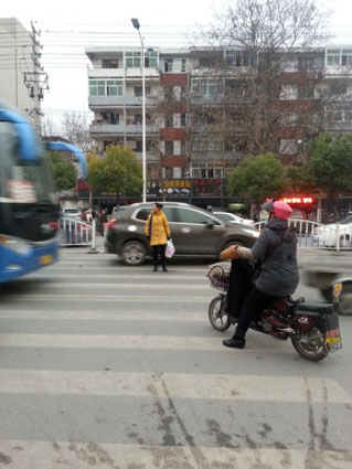 1月6日下午4时45分许,在人民南路前锋小吃街与龙湖小区东门过街路口,淮河早报记者看到,由于来往车辆不断,一些行人和骑电动车、自行车的人在斑马线上等待经过。一名女子走到西侧位于机动车道上的斑马线中间时,被由北向南的行驶的车辆拦住,等过了一辆,另一辆又很快驶来。该女子试图快步走过去,又被驶来车辆的鸣笛声吓止。车辆通行完,她才通过斑马线走到马路对面。