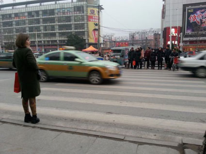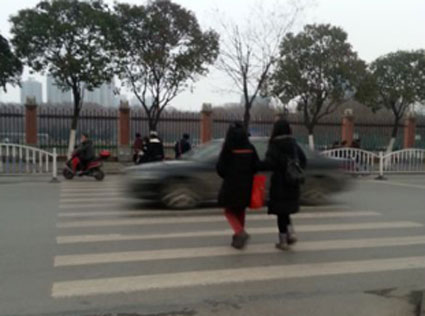 图四:淮南二十四中门前斑马线上,一位行人在车流中等待。