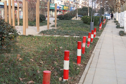 图为绿化带周边新设置的隔离桩。