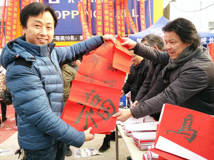 图一: “春回大地春光好,喜满人间喜事多!这个好,麻烦给我写这个!”1月16日,淮南市文联2016“百名书法家春联送万家”第一站来到泉山湖小区、三和镇,为当地群众送上一幅幅高雅飘逸的书法作品。