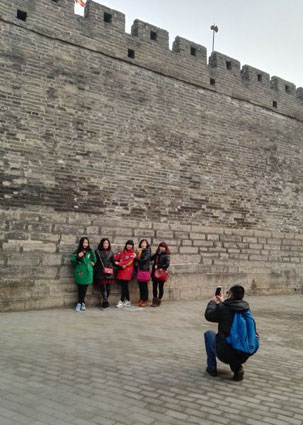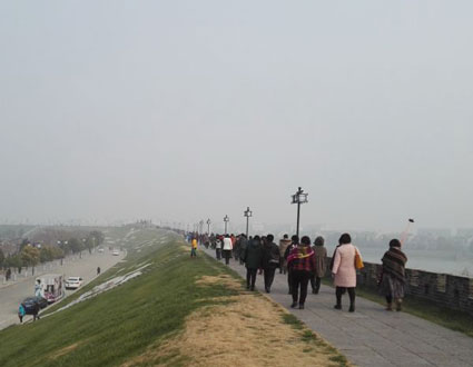 品尝完豆腐宴,购买完豆制品,游客们一路来到寿县城,春申广场上的箭阵表演让大家的情绪再度高涨。游客们登上了寿县古城南城墙,高大巍峨的城楼,古朴的石碑,无不让人感到历史的沧桑。在城墙上凭高远眺,人人显得意气风发,颇有些宠辱皆忘的感觉。游客们大都选择了从南城门沿城墙走向东城门,在历史和现实之间体验着……抚摸着东城门斑驳的城墙,脚踩一道道深深印痕的青石道路,大家发出了阵阵感叹。今年72岁的朱大妈来自合肥,她说,“我到过很多地方,但没来过寿县,这次来旅游才发现,原来身边也有这么值得一看的地方。由于时间关系,此次不能到县城里的其它景点看看,很遗憾,下次一定来弥补。”带着对寿县的留恋,游客们又兴致勃勃地赶往春申君战国文化园,随着电视剧《芈月传》的热播,位于谢家集区李郢孜镇的春申君黄歇墓也成为一大旅游热点。游客们在黄歇墓前谈论着春申君的故事,感受着古人遗风。来自巢湖学院的刘怿文同学对当天的行程很满意,她也是第一次来淮南游玩,她说,在2016年刚开始的时候在淮南王宫许下心愿,祝福家人祝福自己,还吃到花样繁多的豆腐菜肴,领略到寿县古城墙的气势不凡,淮南的年俗文化旅游让人很是难忘!