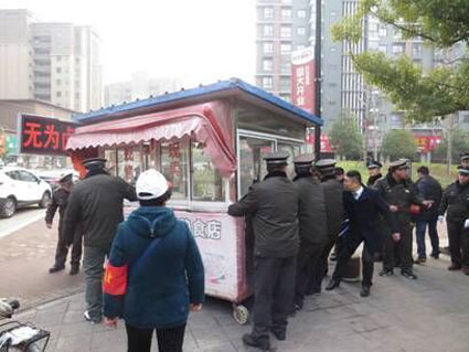 对于该路存在的问题,田区城管行政执法局高度重视,于2015年12月份中下旬便开始筹划整治。该局在成功借鉴其他摊群点整治,特别是淮河新城一期整治成功经验的基础上,结合该路段实际情况,统筹分析,制定了“宣教为主、查处为辅,疏堵结合,定点安置”的整治方针。一方面在充分考虑周边居民生活习惯的基础上,在该路北段划定一片区域,用于规范摆放;另一方面对沿街所有出店、占道经营当事人进行宣传教育。在前期宣传取得较好成效的基础上,该局本着人性化执法原则,专门给各类经营户留出10天时间,用于处理积存货物,做好撤离准备等。
