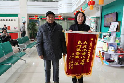 1月20日上午,三河镇农民程师傅将一面印有“火灾无情人有情 农行服务数一流”的锦旗送到农业银行淮南分行营业部负责人王祥英手中,激动地说:“感谢农业银行帮助了我,你们的服务真是一流!”