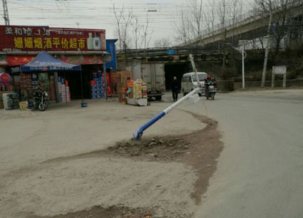 1月20日,有热心市民向淮河早报热线反映,在九龙岗铁路下穿桥旁有一处电子监控的柱子被撞歪倒,已有一段时间了,也没有人处理。接线后,淮河早报、淮南网记者赶到现场,看到在九龙岗铁路下穿桥旁,一家超市门前,一根铁柱子歪倒,上面还有一根电线连接。据附近居民介绍,这根柱子上安装的是一个电子监控,可能是被撞倒的。热心市民希望,相关部门看到后能及时修复。