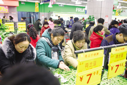 图为:20日晚,朝阳中路某超市内,市民正在挑选蔬菜。