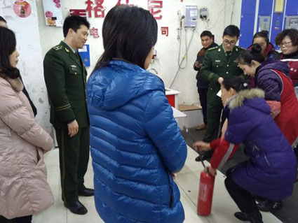 图为:工作人员正在检查蓝天联华超市员工会不会正确使用灭火器。