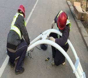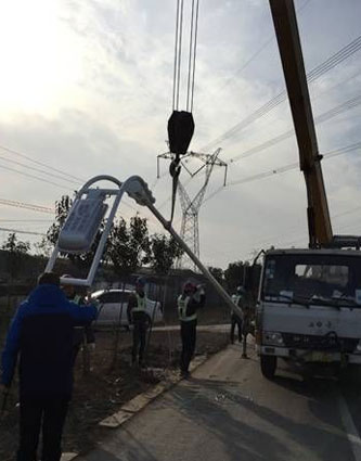 图为施工人员正在加紧安装路灯灯杆(图片由市市政管理处提供)