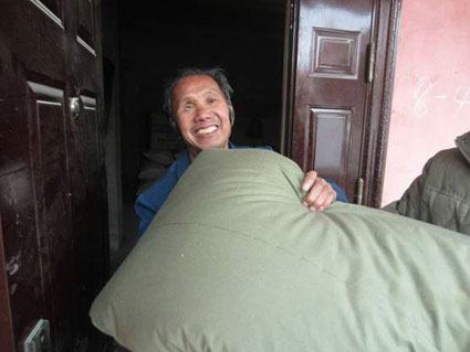 图:一名困难群众收到御寒棉被后露出开心笑容。