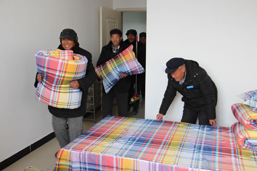 老人们的“新家”就坐落在院子里,是一座“L”型的两层建筑,从奠基到建成这半年多的时间里,老人们每天必做的功课,就是要在工地旁转上一圈,想象一下自己的“新家”会是个什么样子的,过年搬新家则成为老人们的新年愿望。作为2015年省级民生工程,“新家”的构造简洁质朴,尤其引人注意的是玻璃门上贴着的窗花,以及大厅里悬挂着两个大大的中国结,这预示着老人们的新年愿望已近在咫尺。“新家两人一屋,收拾一下就能搬了。”陈长芹说好了规矩,老人们便三五成群聚在一起讨论。