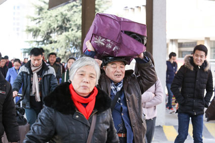 图二:赶车的旅客头顶行李。