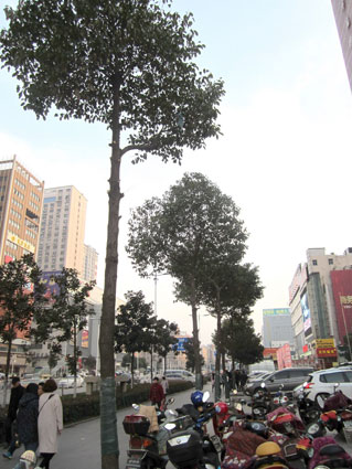 在龙湖中路商贸文化广场东入口附近的人行道上,7棵近20年树龄的香樟同样在17日夜里惨遭厄运。7棵香樟除了顶部尚余一些树冠外,其余枝条被完全锯掉,完全破坏了该处绿化树木统一的美感。据负责巡查该处的园林执法人员钮云松介绍,17日傍晚他下班时发现此处香樟尚且完好,不料18日早上再来此处就发现7棵香樟被人用锯子锯掉大部分枝条,他向附近环卫工人询问得知应该是17日夜里有人下此黑手。18日,园林部门向公安机关报了案。