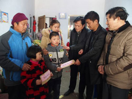 图:曹庵镇关工委和大树村委会为杨刚、杨娜兄妹俩送来慰问金。