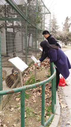 淮河早报、淮南网记者跟随着这三人,看到他们手中拿着一根棍子,棍子上扎着一个小桔子,沿路不时地伸进笼子里,喂笼子里的小浣熊等动物,“调戏”得这些动物不停地往笼子上面扑,而他们自己还拿出手机拍照。
