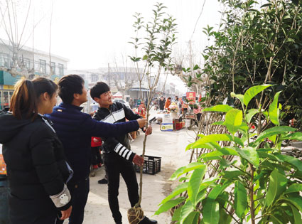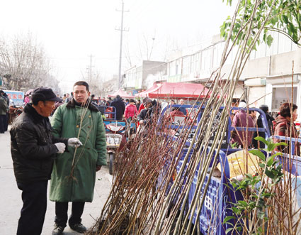 2月22日,在寿县双桥镇街头,前来赶集的农民在选购树苗。近年来,随着社会经济发展和生态环境改善,我市农民购买苗木的种类也悄然发生了变化,桃树、梨树、葡萄等果树类和桂花、香樟、玉兰等观赏性植物的交易日渐走俏。