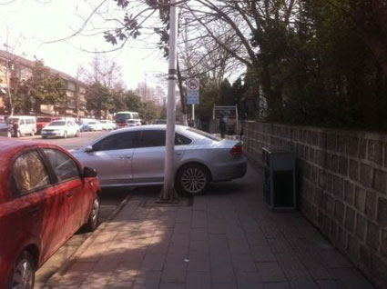 日前,淮河早报、淮南网记者途经金家岭路,看到一辆银灰色轿车霸气十足地横在人行道上——车头部分停放在路边的临时停车位,车身部分则倒停在人行道上。此车紧靠人行道上的垃圾箱,行人想从此通行很难。