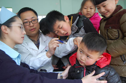 3月1日上午,朝阳医院的医护人员来到田家庵区第五幼儿园奥林园,用生动浅显的语言,为小朋友讲解了耳朵的构造,并耐心细致地向幼儿讲解各种保护耳朵的方法,教育幼儿怎样爱护耳朵、避免意外伤害耳朵的事故发生。活动中,医护人员还为孩子们进行了耳部健康检查。此举,受到了幼儿园老师和孩子们的欢迎。