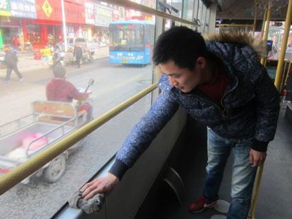 3月为学雷锋活动月,淮南中北巴士有限公司客运二车队28路线公交驾驶员在班组长朱元龙的带领下,利用休息时间,自发自费购买清洁剂、抹布等清洁用品,对包括新更换的9辆公交车在内的10辆车进行保洁,为乘客营造更加清洁干净温馨的乘车环境,受到乘客的称赞。图为3月3日上午,28路驾驶员罗其丹利用休息间隙,用抹布擦洗车厢。