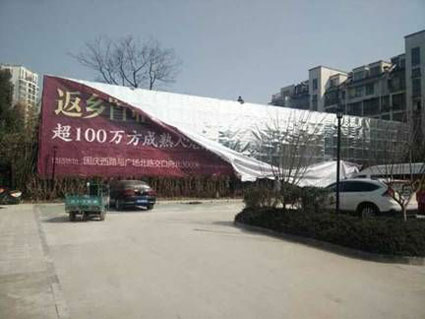 春节前,田家庵区城管行政执法局执法人员巡查中发现,广场北路淮河新城售楼部南侧10米处,设置了一大型户外广告,长约24米,高约5米,铝合金框架材质。经查,该广告未进行任何审批,属违章设置。