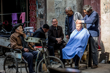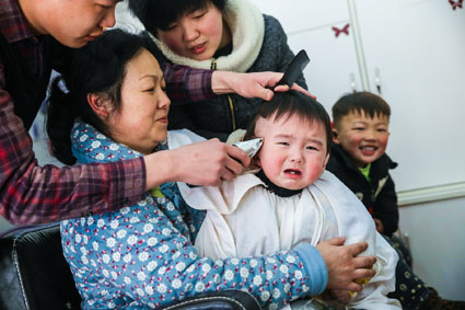 图一::金家岭路上某理发店里,正在“剃头”的萌娃。 图二 :田家庵区北头老街,正在理发的老人们。
