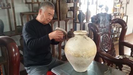 图一:省级非物质文化遗产寿州窑制作技艺代表性传承人沈德亮在研究古寿州窑产品