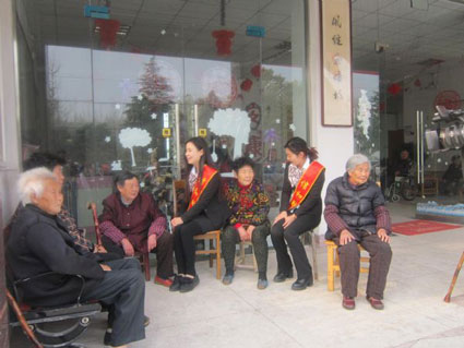 图为两名爱心服务队的志愿者与老人们拉家常。