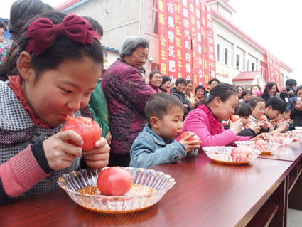 西红柿大赛中,还进行了妙趣横生的“吃西红柿比赛”。比赛分为儿童组和成人组,现场报名,最先把果盘中的2个西红柿吃完者获胜。