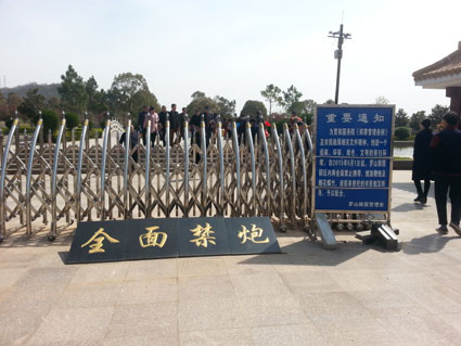 3月24日上午,淮河早报、淮南网记者来到罗山陵园。在罗山陵园入口,一个写有“倡导文明低碳祭扫 树立文明祭祀新风”的横幅悬挂一旁,正门处“全面禁炮”四个大字十分醒目,一旁竖立的展牌上是罗山陵园管理处的一则重要通知。通知上写道“为贯彻国务院《殡葬管理条例》及市民政局相关文件精神,创造一个低碳、环保、绿色、文明的祭扫环境,自2015年5月1日起,罗山陵园园区内将全面禁止携带、燃放鞭炮及烟花爆竹,请来祭祀的市民相互转告,予以配合。”而在大门入口右侧墙面上,则张贴着市文明办、市民政局联合发布的《关于在清明节期间禁限燃放烟花爆竹、焚烧冥纸和文明祭祀、低碳祭扫的倡议书》。