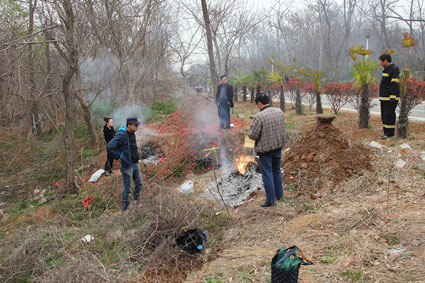 图三:舜耕山风景区管理处森林消防人员劝导焚烧冥币的市民