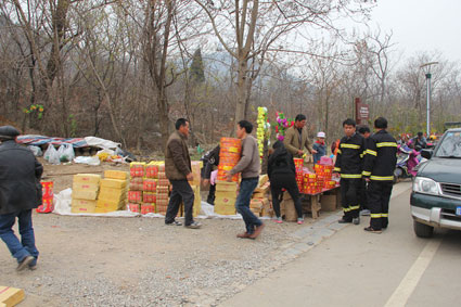图二:舜耕山风景区管理处森林消防人员在劝导消防通道上占道经营的商贩