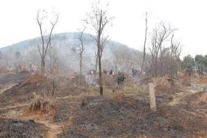 淮河早报、淮南网记者在舜耕山风景区内采访时注意到,不少地方都有被火烧的痕迹。在一个山坡前,整个山坡的枯草和灌木都被烧光了,只留下烧焦的黄土和几棵孤零零的大树。