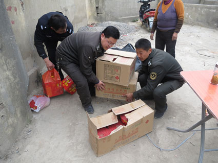 图 :执法人员正在查处违法违规销售的烟花爆竹