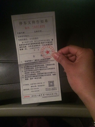 4月2日中午,陈先生在山南新区一家饭店吃饭,他的车子和其它车辆一样就停在饭店门口的空地上,一顿饭吃完,陈先生准备开车离开,突然发现车窗上夹了一张长方形的纸张,这张纸的大小、样式和“车辆罚款单”一个模样,上面清晰的“告知单”几个字让陈先生一下子冒了冷汗。他左右看看两边的车辆,发现每辆车上都夹了一张,难道是城管贴的?陈先生将“告知单”拿在手里,乍一看,上面有“车辆号牌”、“停车地点”的字样和红色的章印,陈先生懊恼地想:吃顿饭100元就这样没了。再仔细看一下,陈先生一下子被逗乐了,原来这是一家车辆服务中心做的小广告,标题是“停车太帅告知单”(如图),告知单上印有该车服中心的各种服务内容。